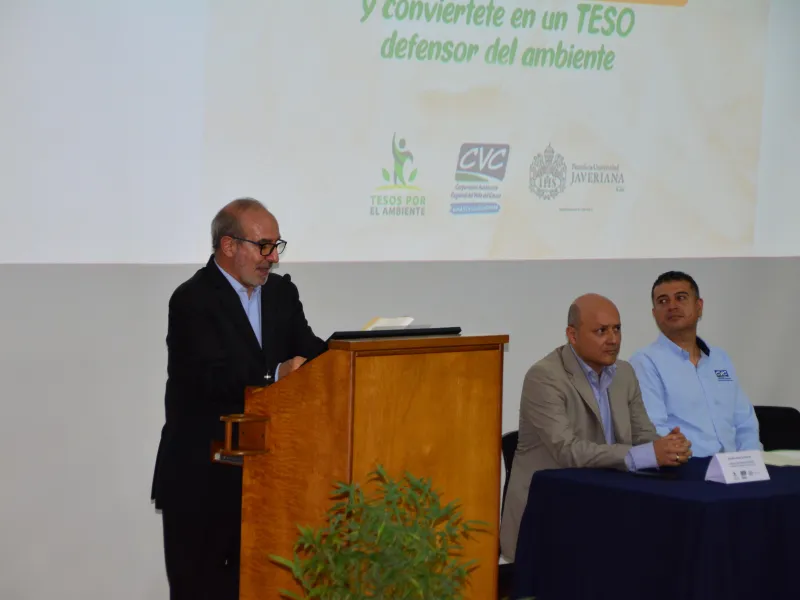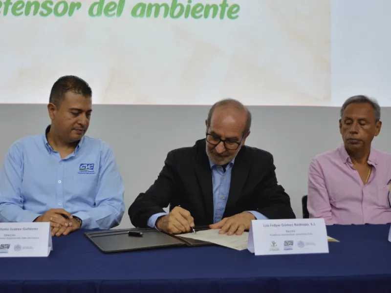 1120 jóvenes del Valle del Cauca iniciarán su proceso de formación como líderes y lideresas ambientales gracias al Diplomado Gestión y Educación Ambiental, 'Tesos por el ambiente', una apuesta entre Javeriana Cali y la CVC. La firma de esta alianza se realizó hoy en el auditorio Los Almendros, con la presencia del padre rector, Luis Felipe Gómez Restrepo, S.J. y el director de la CVC, Marco Antonio Suárez Gutiérrez.